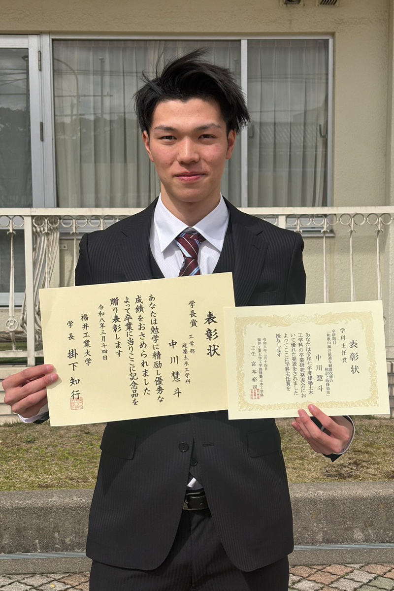 このように積極的に取り組み、和歌山市への耐震改修案報告会も行った中川さんの研究は、卒業研究発表会で高く評価され、学科主任賞を受賞。学長賞とダブル受賞となり、「一生懸命頑張ってきて本当によかった」と笑顔がこぼれた。