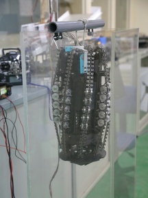 月面は砂地のため、掘削すると蟻地獄のように周囲の砂が滑り落ちて穴が埋まってしまう。しかし、このロボットは、装置の外側に巻きつけたチェーンが全て同じ方向に回転するため、周囲に滑り落ちてくる砂の圧力を利用して掘り進むことができる。「今のところ月の成り立ちを探る地質調査が主な目的ですが、将来、月に人が住むことを視野に入れると、家を建てるための掘削ロボットが必要になってきます。大型の掘削機を月へ運ぶには大きなコストがかかりますから、1つのモーターで全部動かせる軽量な構造にしています」。今後、宇宙開発での活躍が期待されるロボットだ。