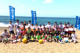 地域との繋がりを意識したプロジェクトということもあり、ピッチ作りにも工夫を施した。地元の波松地区で古くから伝わる「アゼ」という方法で境界線を描き、コーナーフラッグの代わりに地元の小学生がペイントした「浮き」を利用するなど随所に地元愛を溢れさせた。また、大会本番では初の試みとして、学生たちによる実況をつけて試合を盛り上げた。地域の小学生や保護者全員に好評で、参加者すべてが笑顔に包まれた大会となった。「子どもたちの上達が目覚しかったです。今まで選手としての目線しかなかったのですが、できるようになっていく成長ぶりを肌で感じることは、プロジェクトに対するやりがいにも繋がりました。また練習会や大会前のビーチクリーンでは、思ったよりゴミが落ちていたことにショックでしたが、昔から遊んでいた海が少しずつキレイになることに充実感がありました」。