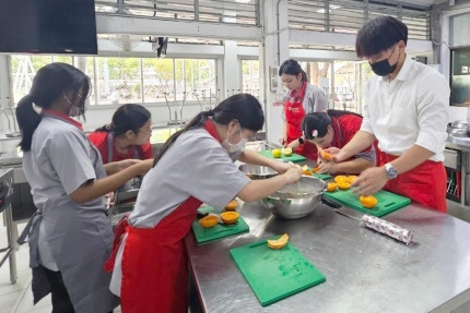 研修先は、タイのバンコクにある国立シーナカリンウィロート大学附属プラサーンミット高校で、江川さんは、主に日本語学科、調理学科、スポーツ学科、そして一部の工学系の学科の授業を担当。日本語学科と調理学科は日本語で、スポーツ学科は英語で、工学系の学科は日本語がわかるタイ人の先生に通訳してもらいながら教えることになった。「実は言葉で困ったのは教室より職員室でした。いろいろな国籍の先生が英語で話しかけてくれるのですが、速くて聞き取れない。もっと勉強しておけばよかったと思いました」。しかし、一生懸命耳を傾け返答し、研修が終わる頃には先生方から「ものすごく上達したね」と褒められたそうだ。