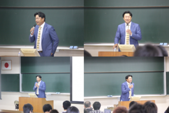 江守商事株式会社 社長 江守清隆氏より、「北陸から世界へ」というテーマでご講義していただきました。歴史の観点から、世界の経済の歩みについて概観され、その歴史の流れの中でこれからも日本が競争力を保って発展し続けるにはどうすればよいかという事を説明されました。